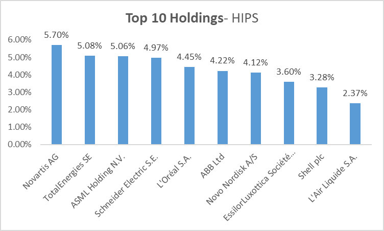 HIES tracks 135 companies, with the top 10 (~42.8%5 of portfolio) as of Aug 29, 2025, including: