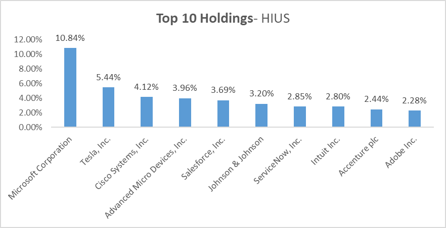 HIUS includes 125 holdings, with the top 10 (~41.63% of portfolio) as of Aug 29, 2025, including: