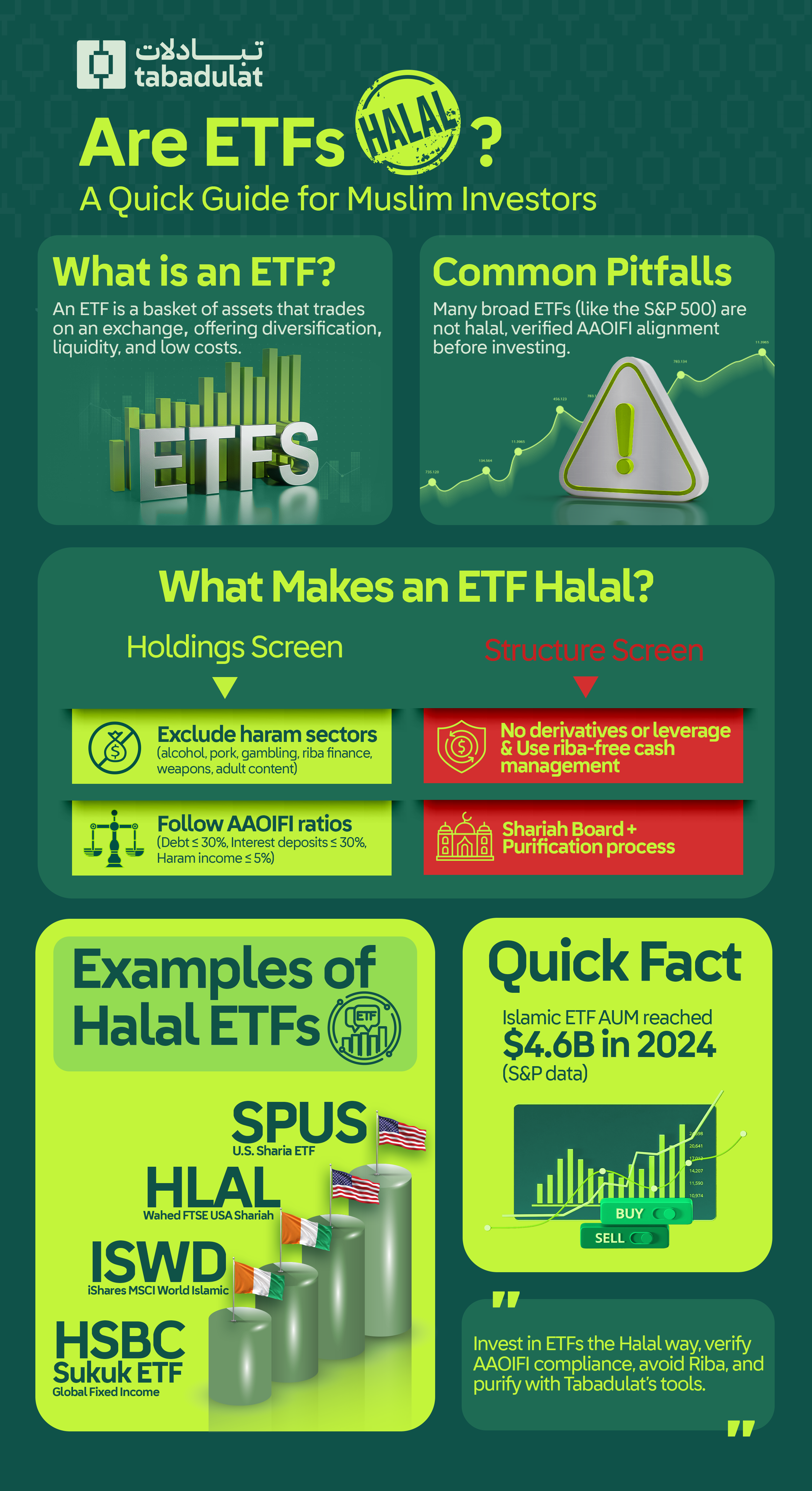 Are ETFs Halal? This guide explains how ETFs work, what makes them Shariah-compliant, and which funds follow AAOIFI standards. Learn the risks, top Halal ETFs, and how Tabadulat helps you screen 40,000+ stocks & ETFs daily for true Islamic investing.
