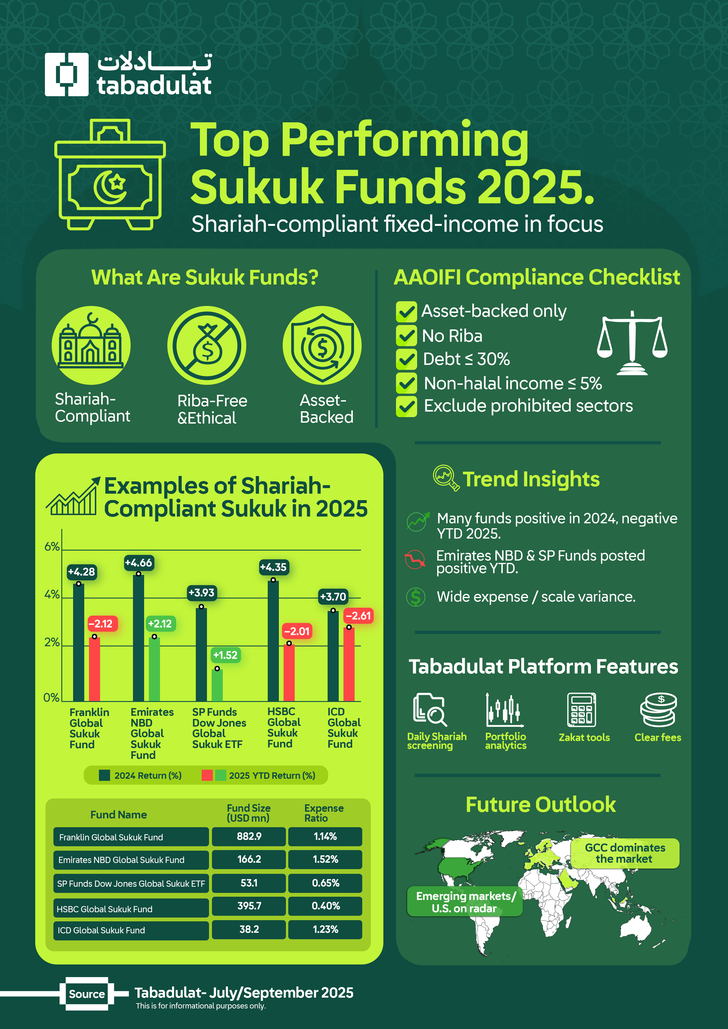 In 2025, investors can access Sukuk funds and Halal ETFs through platforms such as Tabadulat
