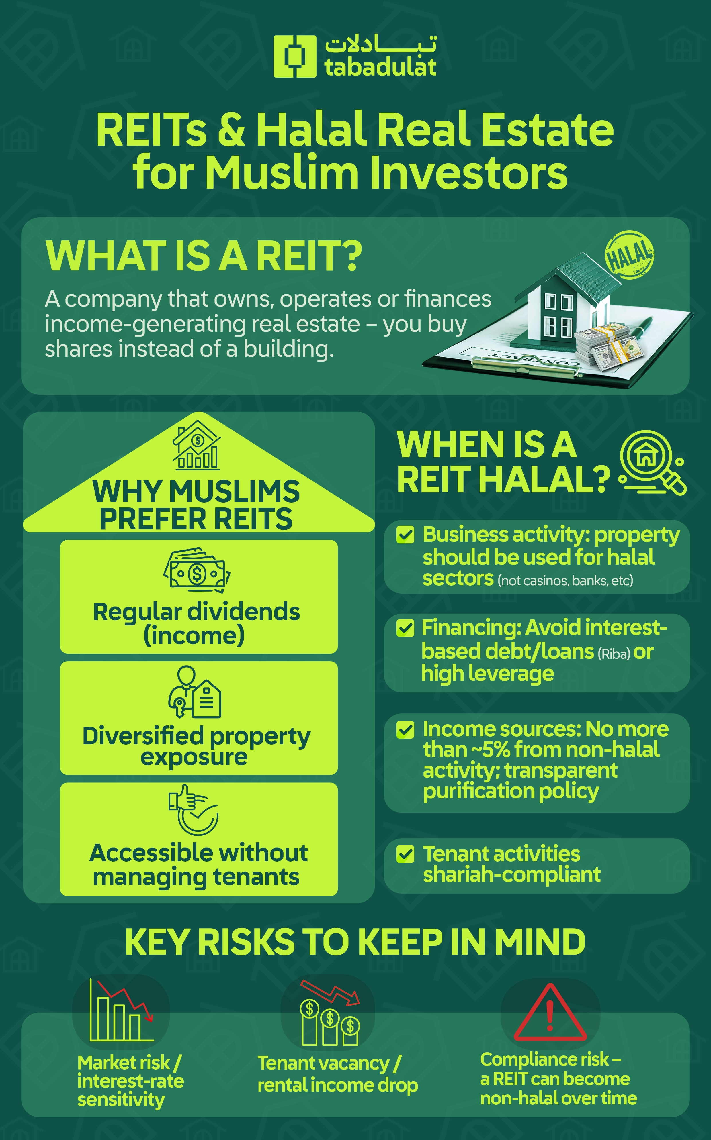 A Shariah-compliant REIT typically focuses on residential, industrial, logistics or healthcare properties, not Haram sectors.